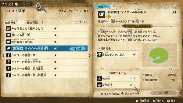 (「【高難度】ライダーの特訓相手」はあらすじ「閉ざされた巣」まで進むと受注できるようになります。)
