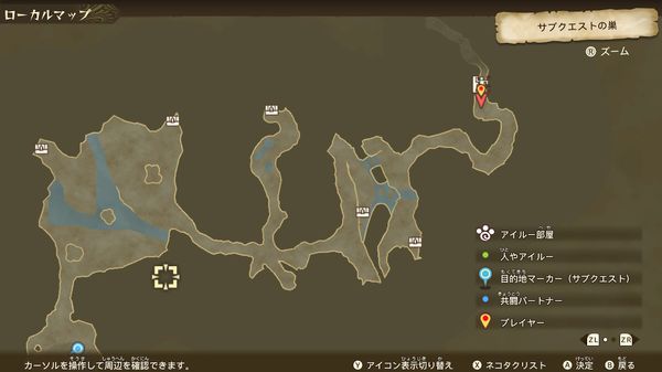 この「サブクエストの巣」は少し広めのマップで、決まった形をしていて、入る度に宝箱がランダムで配置される便利な巣となっています。