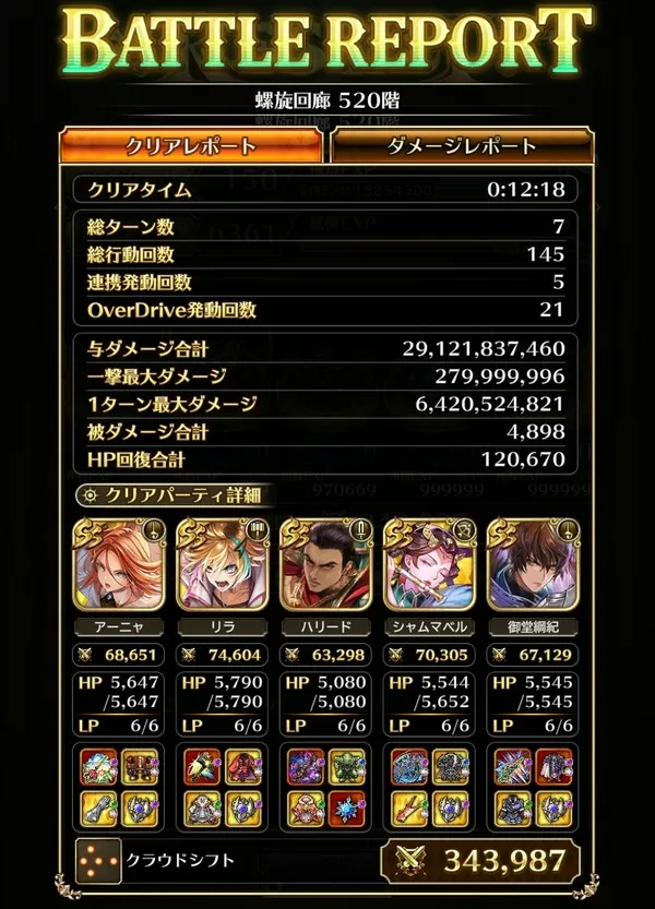 筆者が実際に螺旋回廊520階を7ターンでクリアした際の編成をご紹介します。