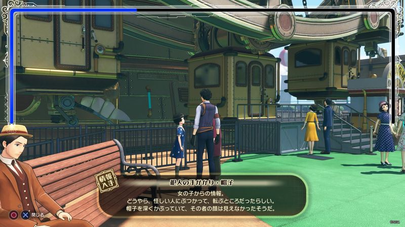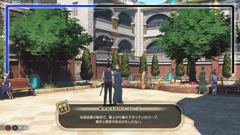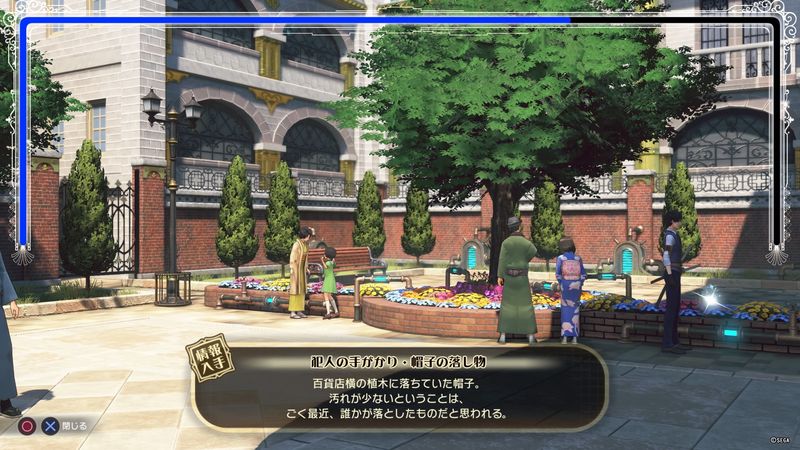 ⇒広場の奥の植え込みを調べると『犯人の手がかり・帽子の落と物』の情報を入手。