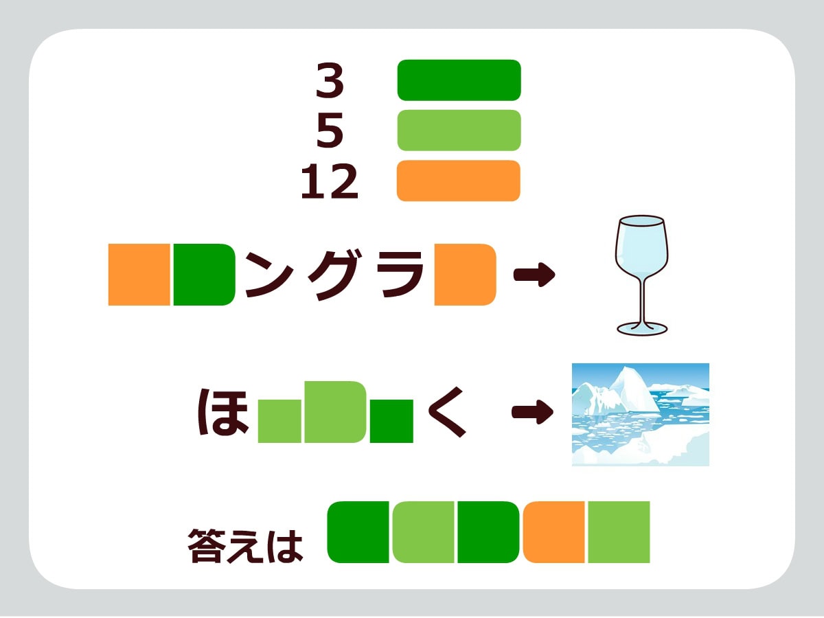 ■ヒント2『右の2つのイラストから上の枠に文字を当てはめると以下のようになります。』